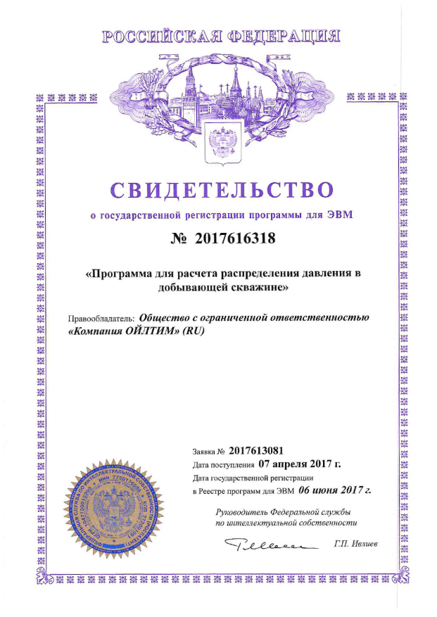 Свидетельство о государственной регистрации программы для ЭВМ. Программа для расчета распределения давления в добывающей скважине